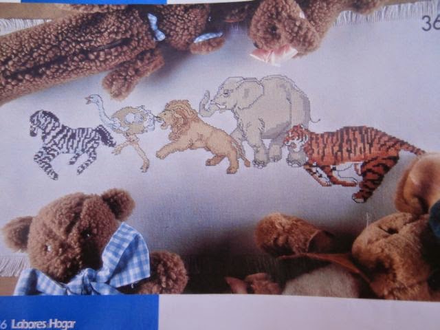 Yhdessä lehdessä oli neule- ja virkkausmallejakin. Espanjankielestä en ymmärrä sanaakaan eikä ole kiinnostusta opetellakaan, mutta ainahan voi katsella nättejä kuvia, ja ristipistoja nyt voi tehdä vaikka siansaksankielisestä mallista, piirrosten kieli on universaali. :)