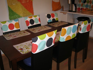 Tammikuussa meille tuli uusi isompi ruokapöytä, josta kyllä tykkään muuten, mutta tuolien päällinen on mustaa keinonahkaa. Ja musta on kaikkein ällöttävin väri, mitä maa päällään kantaa. Ruokailuryhmää ostaessamme ainoa asia, joka sai minut miettimään ostopäätöstä, oli nimenomaan musta väri. Mutta kun ryhmä oli ihan huipputarjouksessa, niin päädyimme sen ostamaan, ja minä jäin heti miettimään, miten voisin piilottaa sen mustan värin kivempien värien alle. Tuolihuput tuntuivat ensin kivalta ajatukselta, mutta sellaisten ihan maahan asti ulottuvien helmallisien huppujen kanssa olisi tullut vastaan ensinnäkin budjetti ja toisekseen ompelijan rajalliset taidot. Minä ompelen mielelläni verhokäänteitä ja tyynyjä ja kaikkea muutakin, mihin ei tarvitse ottaa tarkkoja mittoja tai piirrellä kaavoja. Joten ei pitkiä tuolihuppuja, kiitos! Sitä paitsi minusta ne sellaiset helmalliset tuolihuput näyttävät vähän raskailta. Ja lapsiperheessä keinonahkapäälliset ovat ihan loistavat ruokapöydän tuoleissa, kun ne voi pyyhkäistä kostealla rätillä puhtaiksi - kangaspäälliset pitäisi nakata joka ruokailun jälkeen pesukoneeseen, ainakin lasten tuoleista.